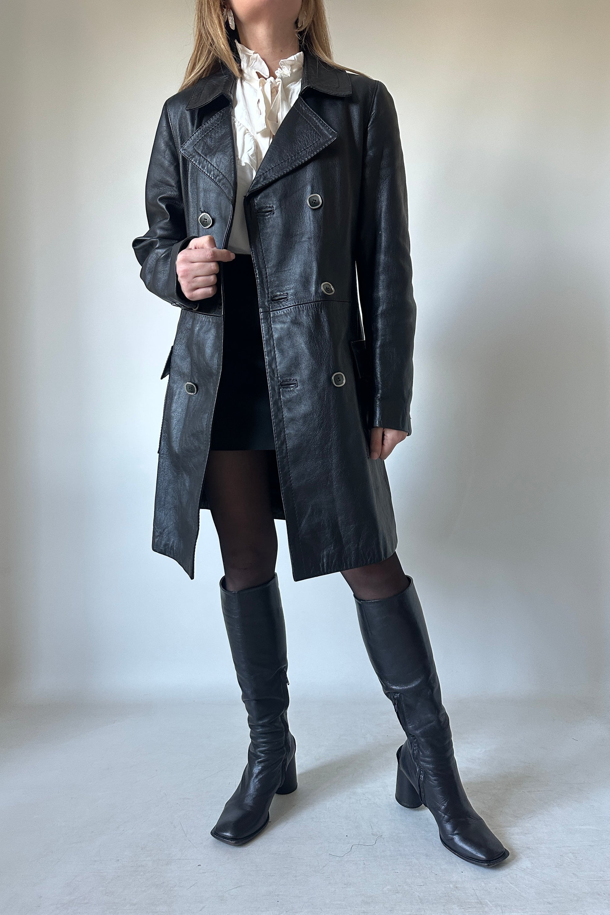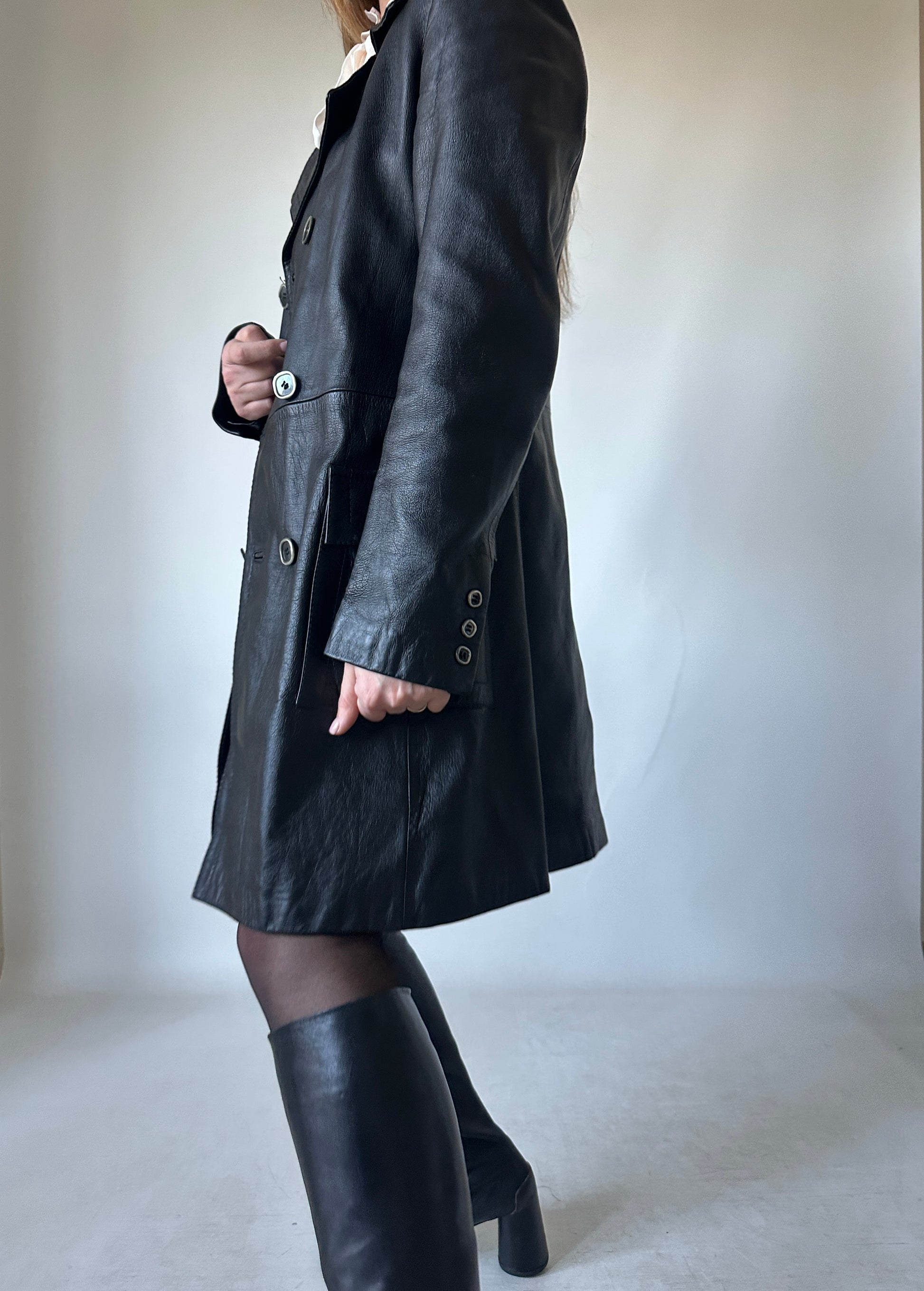 Trench vintage anni 90 in pelle nera di ottima fattura artigianale, bella lunghezza al ginocchio, doppiopetto con fit avvitato, bottoni in simil madreperla grigi, con tasche laterali, dettaglio di fodera interna logata.