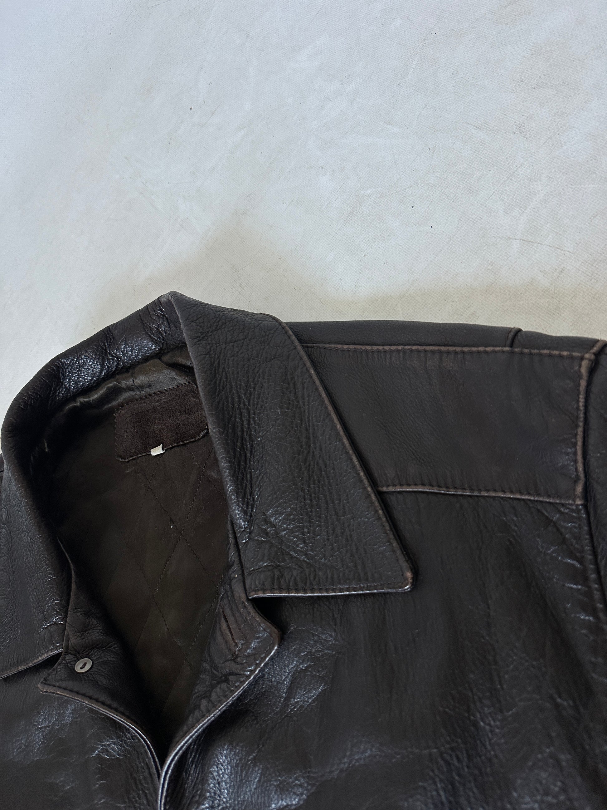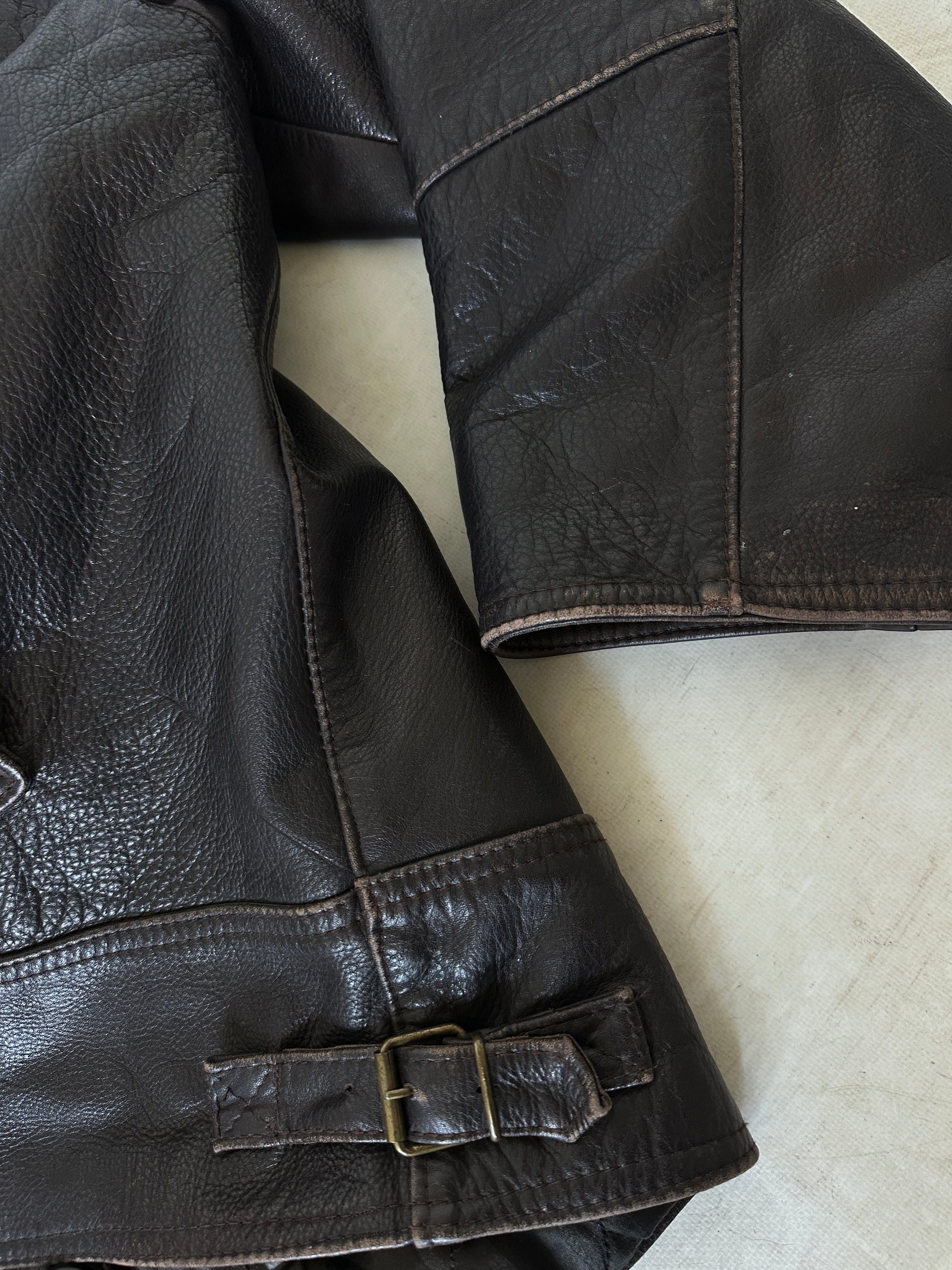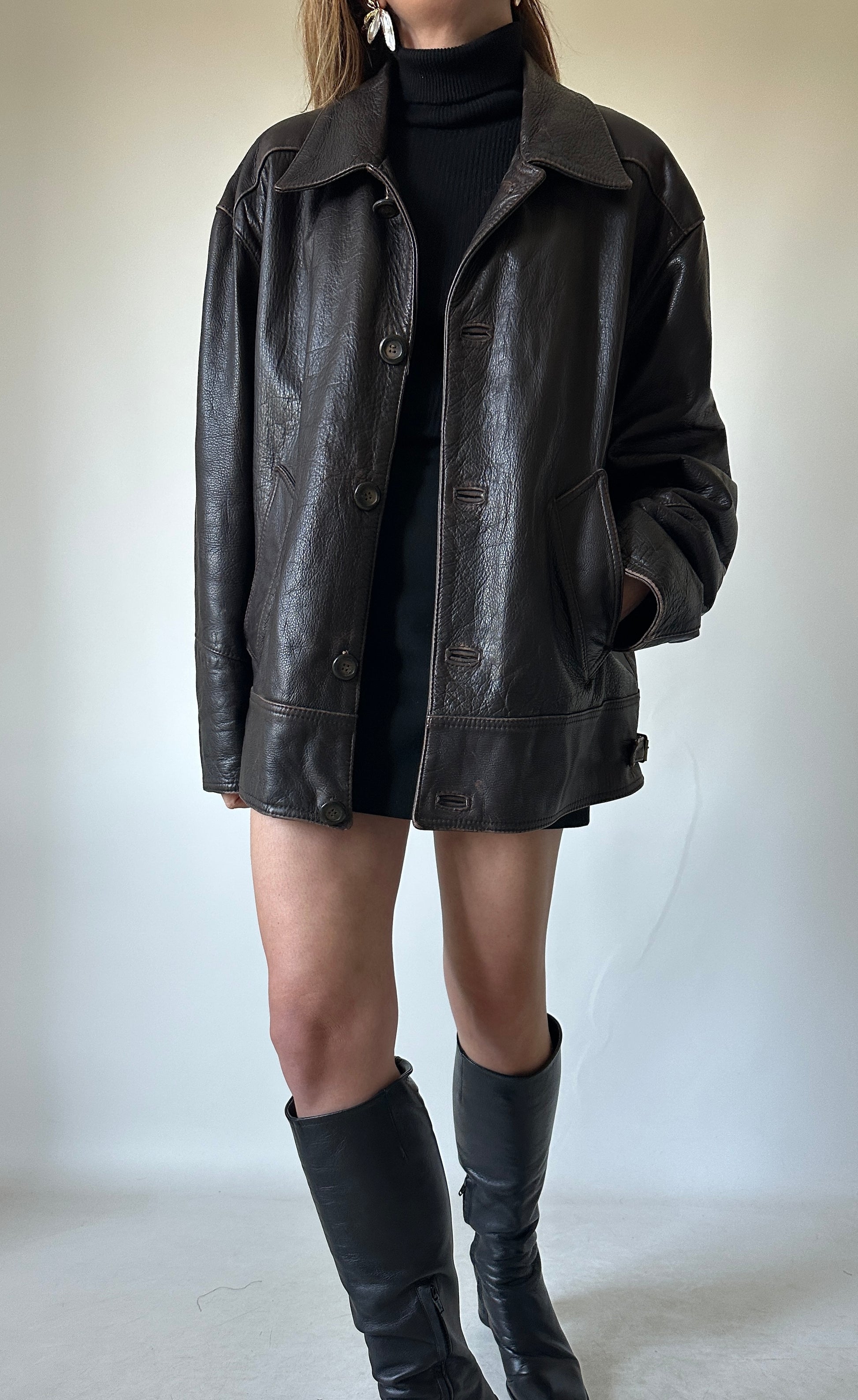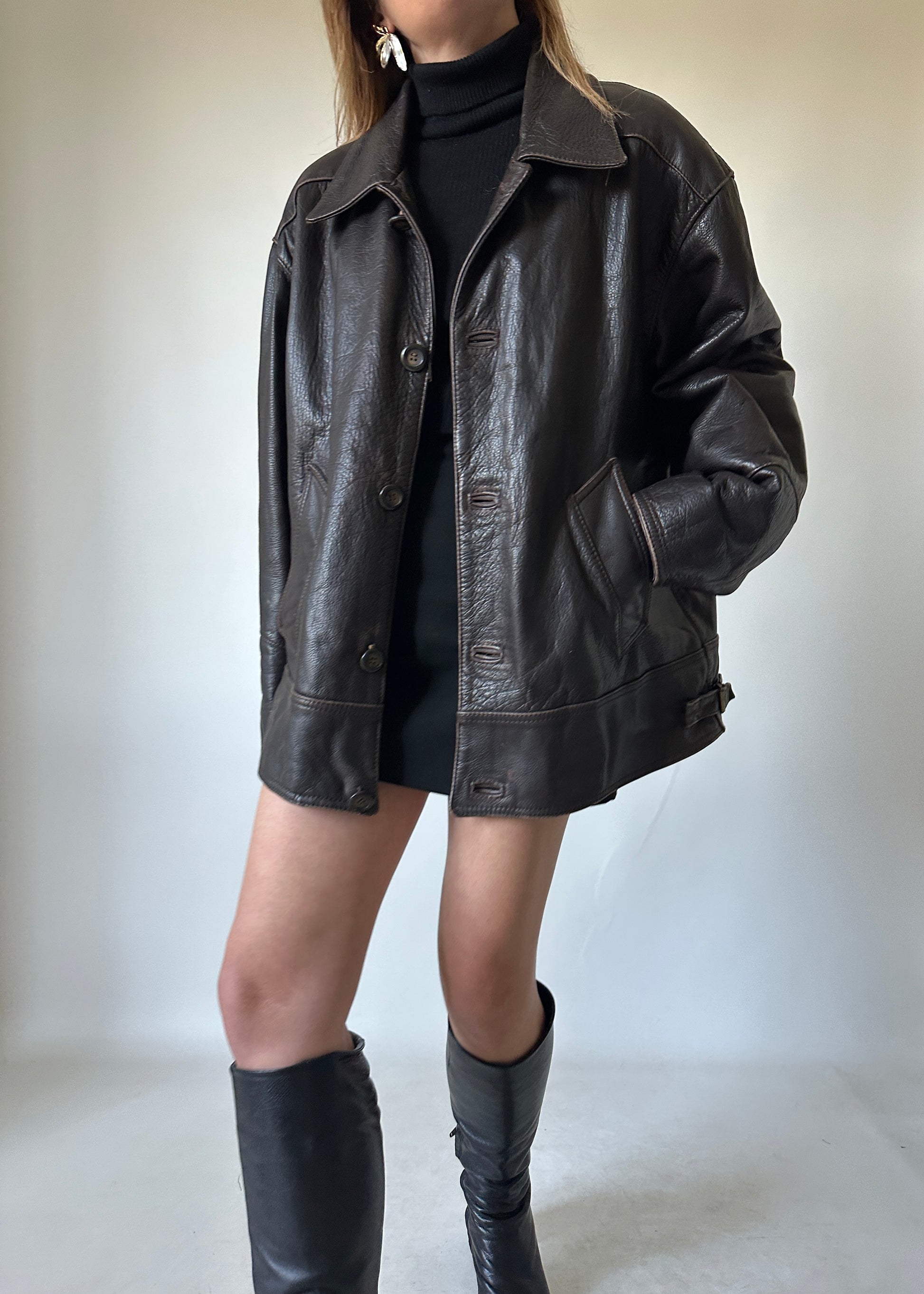 Giacca vintage in pelle cioccolato, modello monopetto dal taglio dritto e vestibilità ampia che deve piacere, pratiche tasche laterali, trapuntato all’interno dunque coprente.